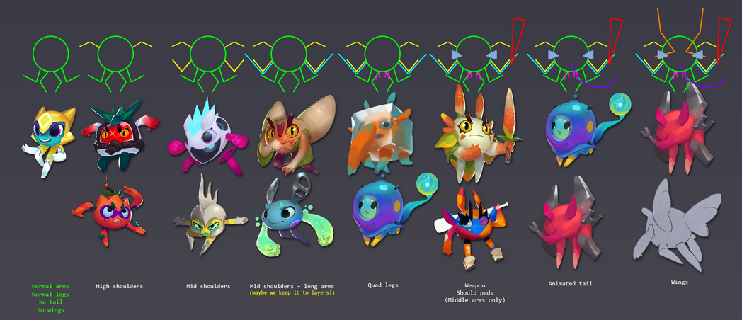 I updated and maintained the Spark's rig, and created the Space Invaders rig. Every Spark used the same rig--it could adapt to different proportions thanks to modular bone setups for arms, tails/wings, and props! The Space Invaders rig, though much less complex, followed similar logic.